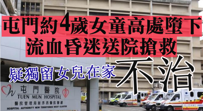 Fun享健康家庭生活生活時事親子 【疑獨留女兒在家】屯門約4歲女童高處墮下 流血昏迷送院搶救不治 2020-02-21 Share on Facebook Tweet on Twitter 屯門蝴蝶邨蝶舞樓,下午約2時,警方接報獲一名保安員報案,指一名年幼女童從上址高處墮下,倒臥地上流血昏迷,警方及救護員到場,將女童送往屯門醫院救治,可惜最終不治。 據悉,女童年約4歲,警方正圍封現場調查。最新消息指女童與家人居於上址一高層單位,墮樓時家中沒有成年人,父母不在家,警方正設法尋找女童的家人。 閱讀全文
