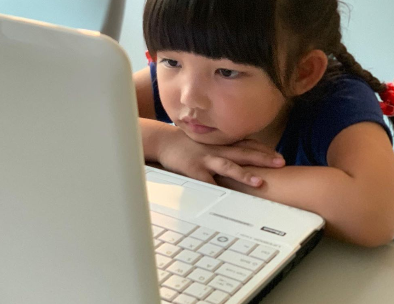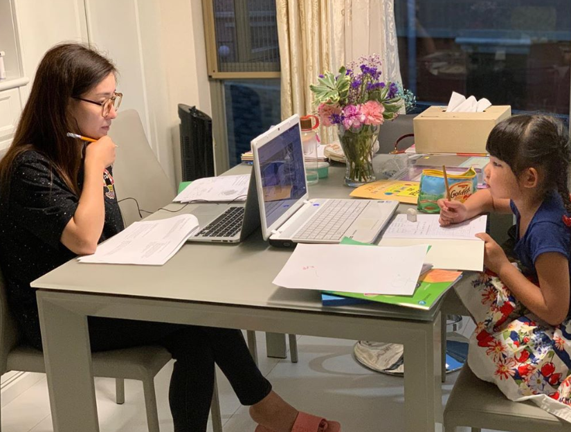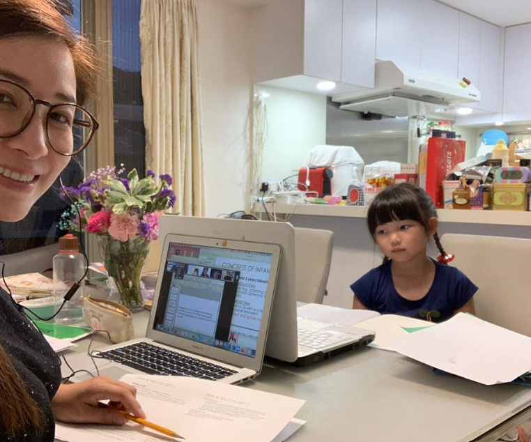 她上載了一張與女兒齊齊坐在餐桌前,各自對着電腦溫書做功課,而女女就當然都覺得好悶,看到螢光幕都發了呆:「而我同豆豆最近就各自網上上堂👩🏻💻…雖然成效始終冇返學咁好…不過老師真係好用心教導,而且見到自己老師教,小朋友都有種『肅然起敬』嘅感覺,會認真學習! ✍🏻大家一齊加油💪🏻 ﹗」