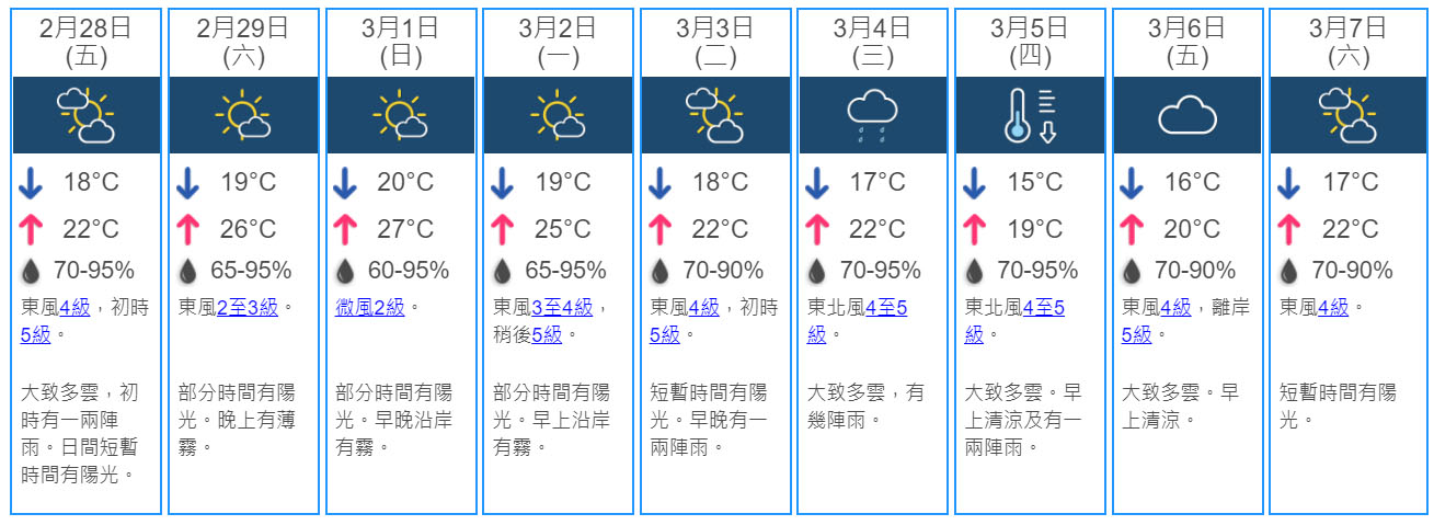天文台預測未來9日天氣,明日(28日)大致多雲,初時有一兩陣雨,日間短暫時間有陽光,氣溫18度至22度