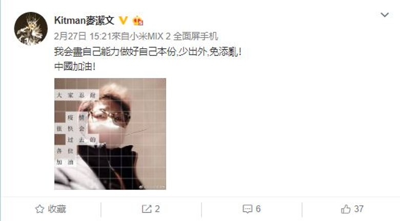 媽媽Kitman昨日在微博貼上一張戴住口罩的相片,留言:「我會盡自己能力做好自己本份,少出外,免添亂!中國加油!」