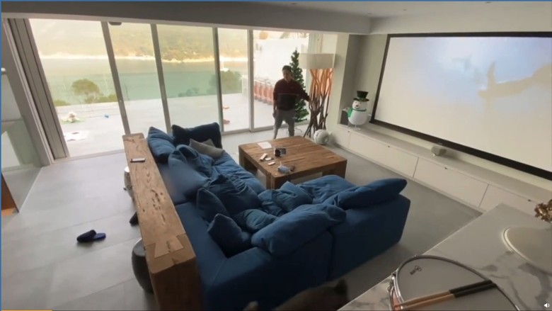 而牆上的投影屏幕最少都過百吋大,廳中有樓梯,此豪宅起碼有兩層,而且有落地玻璃門窗,坐擁無敵靚海景,是為不少人的Dream House!