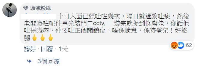事後有相信熟悉店方的網民再補充,「10日入面已經吐咗幾次,隔日就過嚟吐痰,然後老闆為咗呢件事先裝門口cctv, 一裝完就捉到條x佬,你話佢吐得幾密,仲要吐正個開鎖位,唔係隨意,係特登架!好x嬲」。