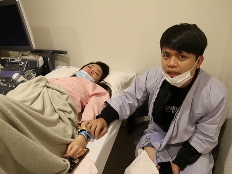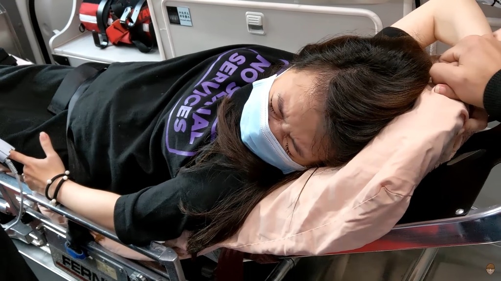 從蔡阿嘎工作室同事拍攝的影片可見,「二伯」坐在椅子上扶著腰,並要在救護員攙扶下才能上救護車,看起來非常痛苦。送院後,因宮縮情況嚴重,需要服藥及吊針安胎,並留院兩日觀察,慶幸胎兒平安,沒有出血和早產跡象。