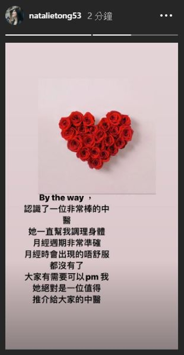 及後,她再上載一段文字,表示自己月經好準時,間接否認佗B傳聞:「By the way,認識了一位非常棒的中醫,她一直幫我調理身體,月經週(周)期非常準確,月經時會出現的唔舒服都沒有了。大家有需要可以pm我,她絕對是一位值得推介給大家的中醫。」