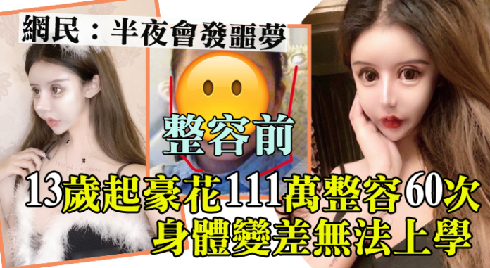 內地網紅「小z娜娜」,自稱從13歲開始整容,3年來做60次手術,花費100萬元人民幣(下同,約111萬港元),並稱「除了頭蓋骨以外,能削的地方都削了」,甚至因為整容整到身體變差、無法上學。