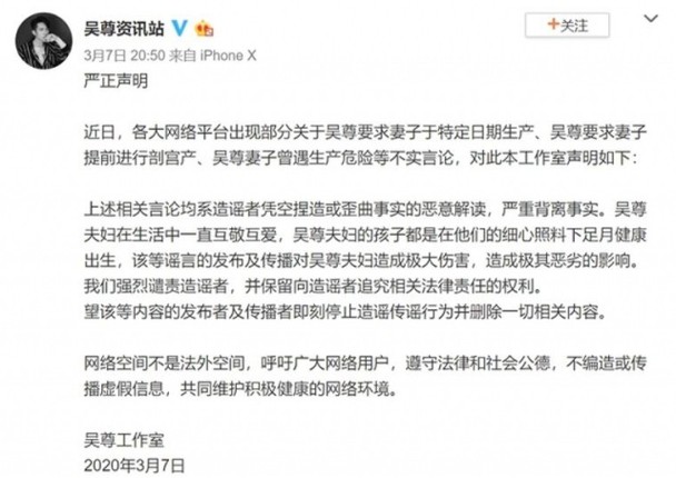 聲明內容強調包括要求老婆於特定日期生產、提前進行剖宮產、妻子曾遇生產危險等全為不實言論,強調女兒足月出世:「吳尊夫婦在生活中一直互敬互愛,吳尊夫婦的孩子都是在他們的細心照料下足月健康出生。」並要求發文者及傳播者刪除一切相關內容。
