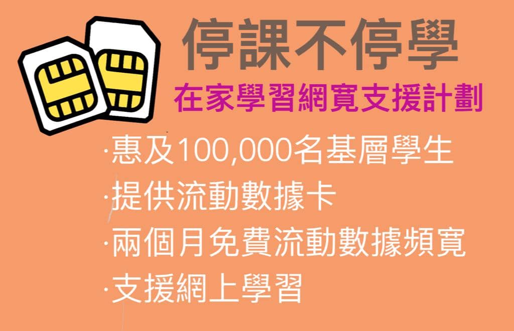 賽馬會慈善信託基金與香港青年協會和小童群益會合作,推出「在家學習網寬支援計畫」,獲電訊供應商捐出價值四千二百萬元、共十萬張SIM卡,供居住於劏房、舊樓及偏遠地區而未能得到高速上網服務的基層中、小學生申請,讓他們可以無間斷在家進行網上學習。