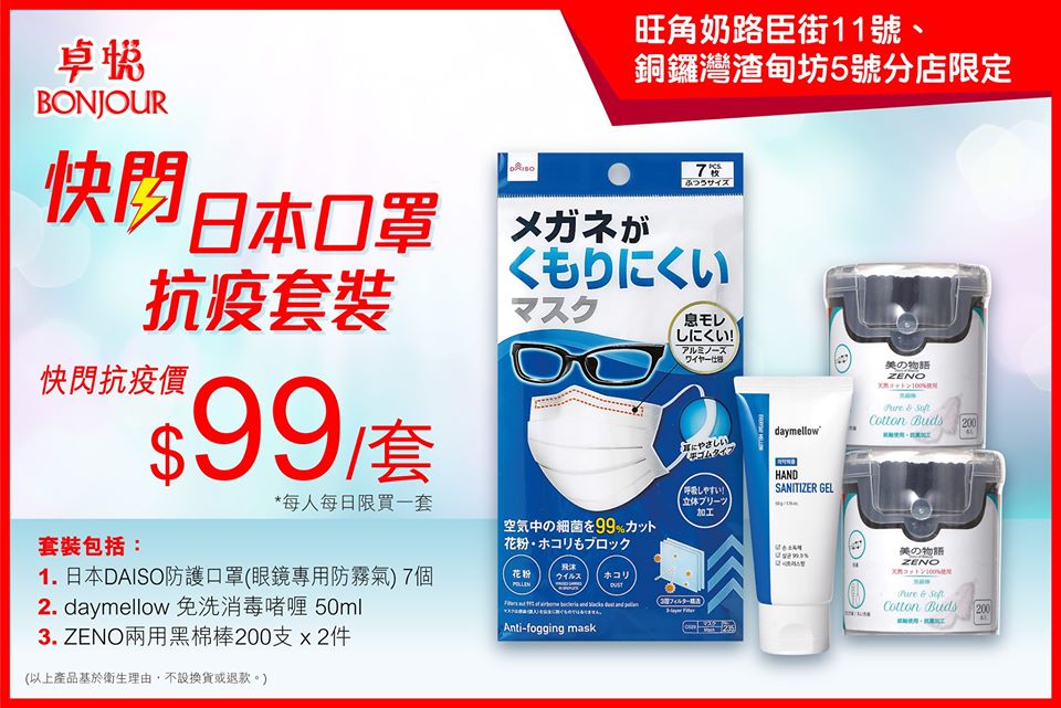 卓悅剛剛在專頁公佈今天出售$99抗疫套裝,内有Daiso口罩7個。
