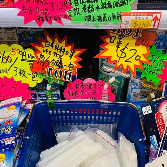 有網民在 Facebook 群組上報料,指有深水埗藥妝店以$20一包10個開售日本外科口罩,平均每個口罩僅售2元,十分大眾化。根據店內的產品介紹牌指,此口罩不但是日本牌,更是 VFE 95% 規格。注意每位顧客只限購買一包,售完即止。