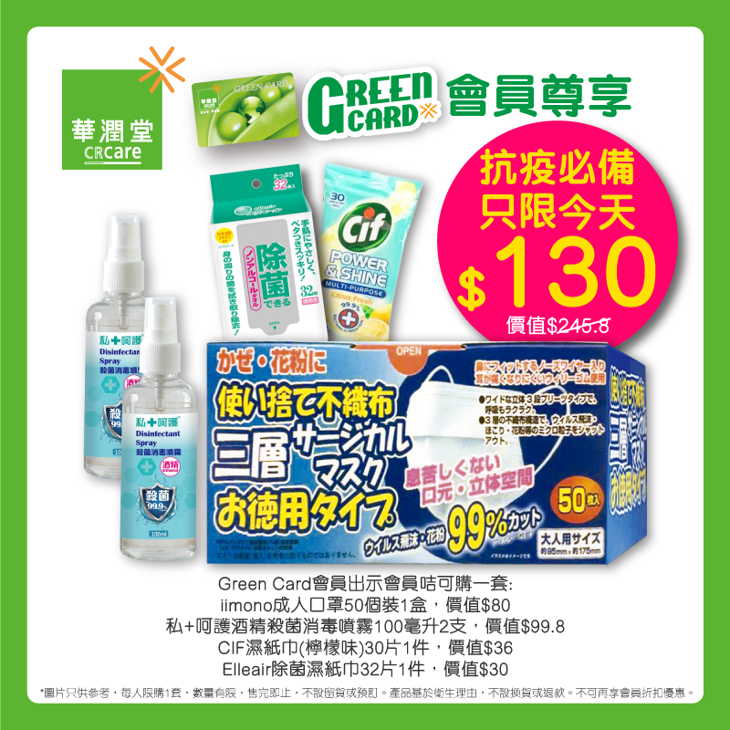 華潤堂在社交網表示,今日推出抗疫必備套裝, 只售$130 (價值$245.8),只限 Green Card 會員購買 。Green Card 會員出示會員咭可每人限購1套,優惠只限今天,數量有限,售完即止。