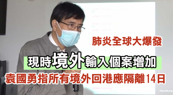 新冠肺炎已在全球大流行,香港大學微生物學系講座教授袁國勇今(16日)在電台節目時表示,建議所有由境外回港人士都要自我隔離14日,他亦已經向政府提出有關建議。