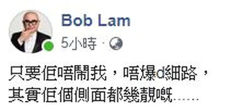 Bob就貼出了老婆一張側臉素顏相,他留言:「只要佢唔鬧我,唔爆啲細路,其實佢個側面都幾靚嘅……」,Bob明寸暗讚老婆,網民回應「一早起身就咁勇敢」、「玩命caption」、「點解我覺得身同感受嘅」、「撩交嗌系列」、「其實你係咪身痕?」