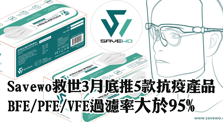 【BFE / PFE / VFE 過濾率大於95%】Savewo 救世3月底推5款抗疫產品
