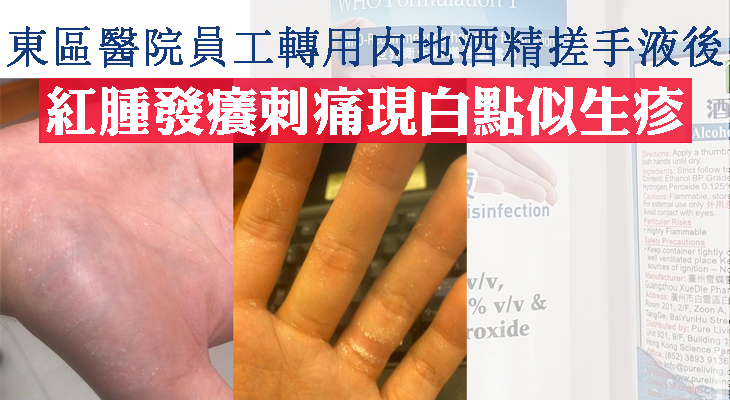 最近又報道指,有醫護人員投訴,東區醫院上星期五轉用內地廣州白雲區生產的酒精搓手液,有員工使用後有少許刺痛感覺,手掌亦出現白點,需要洗手才能移除,之後再無不適感覺。
