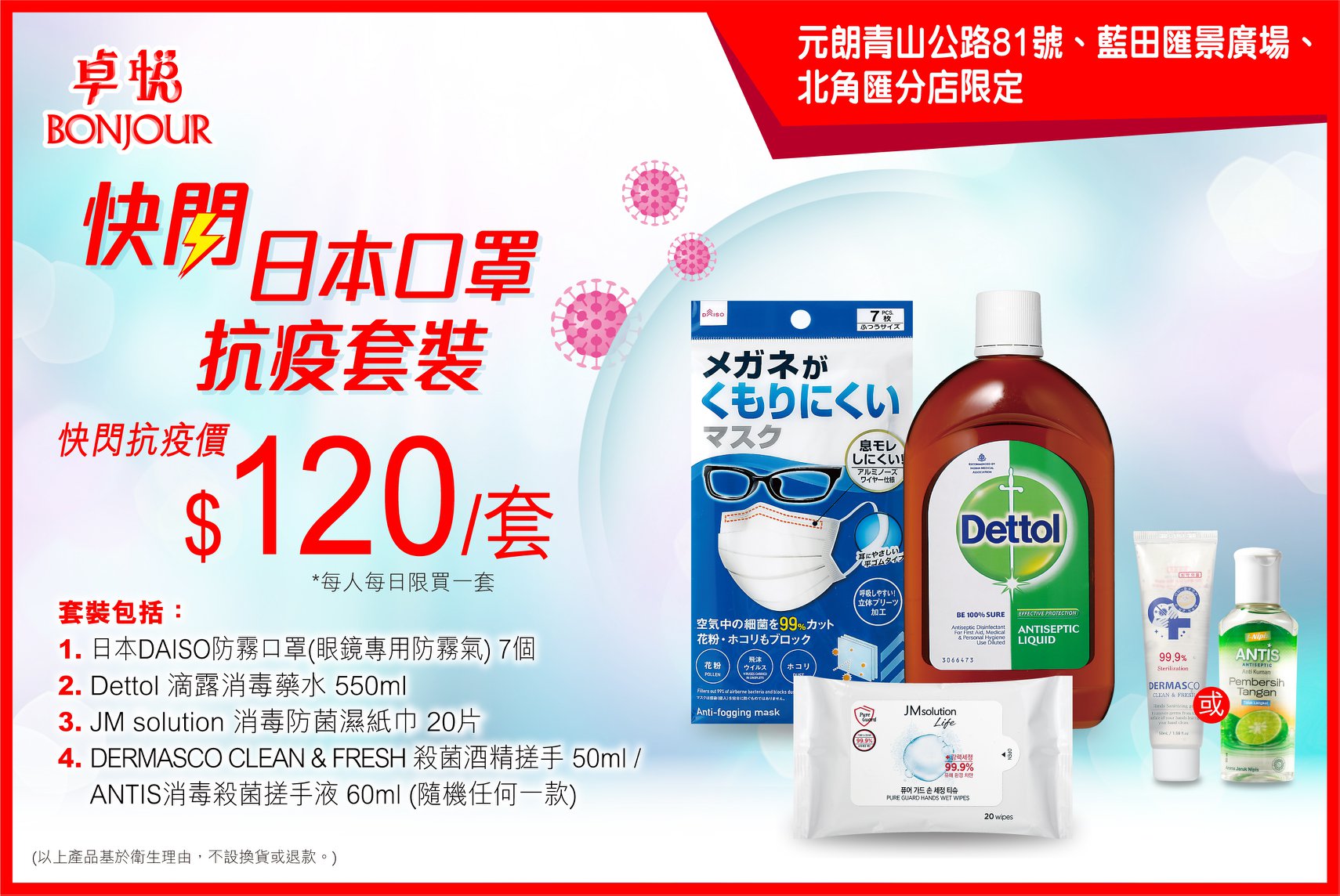 包括:日本 DAISO 防霧口罩、滴露消毒藥水、消毒防菌濕紙巾及殺菌酒精搓手液。一套售價為港幣 120 元,每人每日限買 1 套,日本口罩抗疫套裝僅在 3 間指定分店有售,數量有限,售完即止。