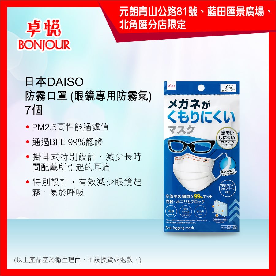 –日本 DAISO 防霧口罩(眼鏡專用防霧氣) 7 個