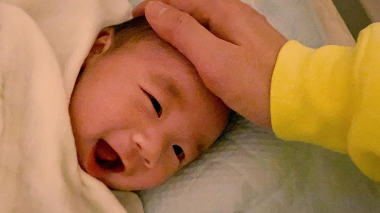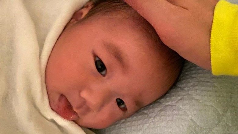 最近基仔再在社交網公開兒子容貌,發了兩張正面照。看到新手爸爸基仔用手摸住囝囝個頭,B仔立即笑得好開心,一對腰果眼相當可愛!