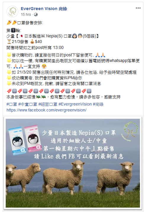 新冠肺炎蔓延全球,不少市民每日都為抗疫產品奔波,尤其是口罩。EverGreen Vision 尚綠昨日表示,今天(3月21日)起分幾輪開售多款日本口罩 ,交收方法只包平郵,可另選智能櫃取貨(自付費用),購物滿$250包送貨到智能櫃。