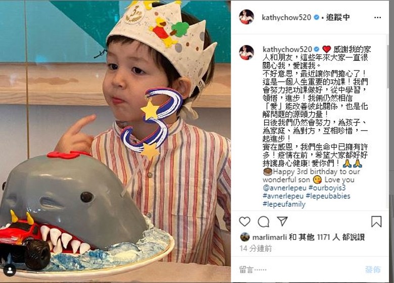 沉默了個多星期,Kathy最近終於現身社交網,同時上載細仔Avner慶祝3歲生日的照片。