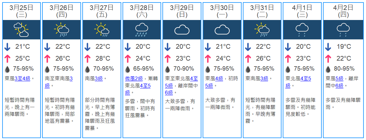 明日周三短暫時間有陽光,晚上有一兩陣驟雨。氣溫21至25度。周四短暫時間有陽光。初時有幾陣驟雨,局部地區有雷暴。氣溫22至26度。周五部分時間有陽光。早上有薄霧,晚上有幾陣驟雨及狂風雷暴。氣溫22至28度。