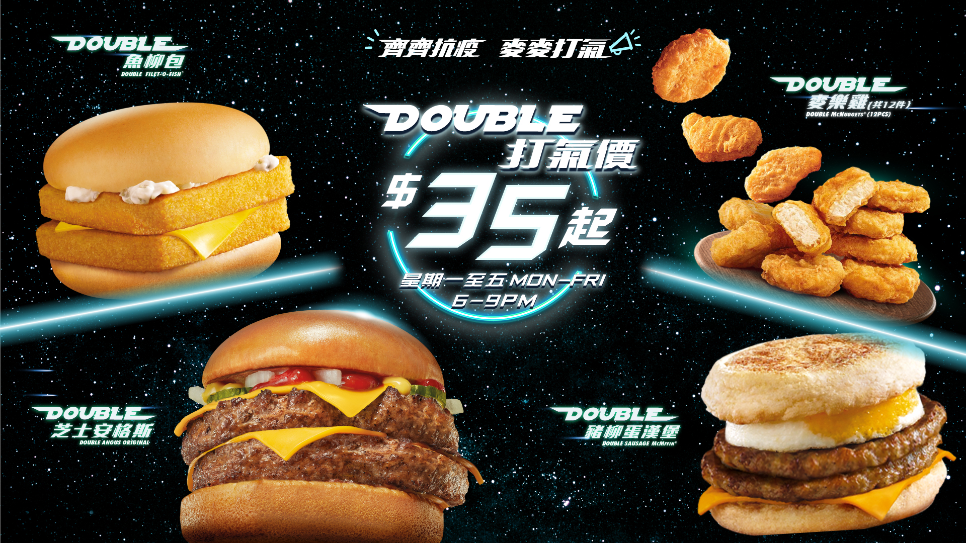另3月30日起將再度推出Double系列,包括Double魚柳飽、Double麥樂雞 (共 12 件)、Double豬柳蛋漢堡和Double芝士安格斯,而星期一至五(公眾假期除外)晚上6至9時,此系列會以打氣價發售,讓上班人士放工後能於晚餐時段享用。