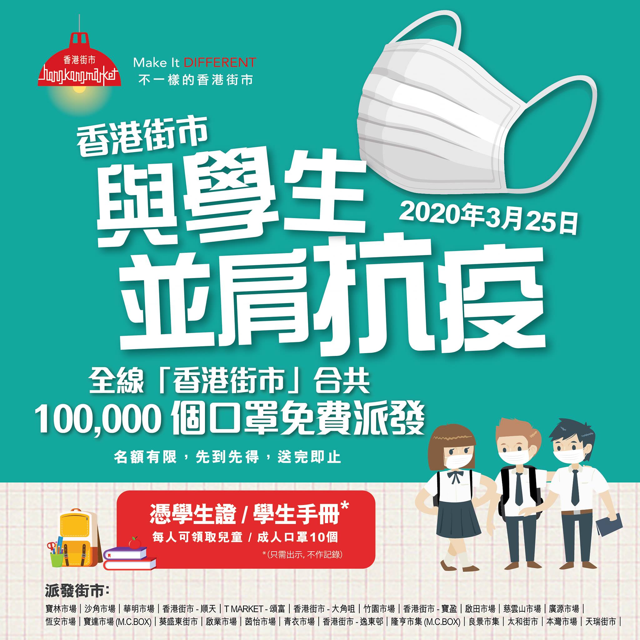 香港口罩一直短缺,疫情嚴峻下學生復課遙遙無期,最近有企業於今天(3月25日)向學生派發10萬個免費口罩,在全港23個街市派發,學生可憑學生證或學生手冊領取10個口罩。
