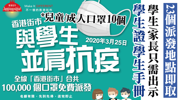 香港口罩一直短缺,疫情嚴峻下學生復課遙遙無期,最近有企業於今天(3月25日)向學生派發10萬個免費口罩,在全港23個街市派發,學生可憑學生證或學生手冊領取10個口罩。