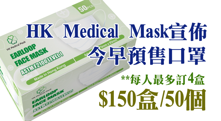 【每人最多訂4盒】HK Medical Mask宣佈今早預售口罩 $150盒/50個