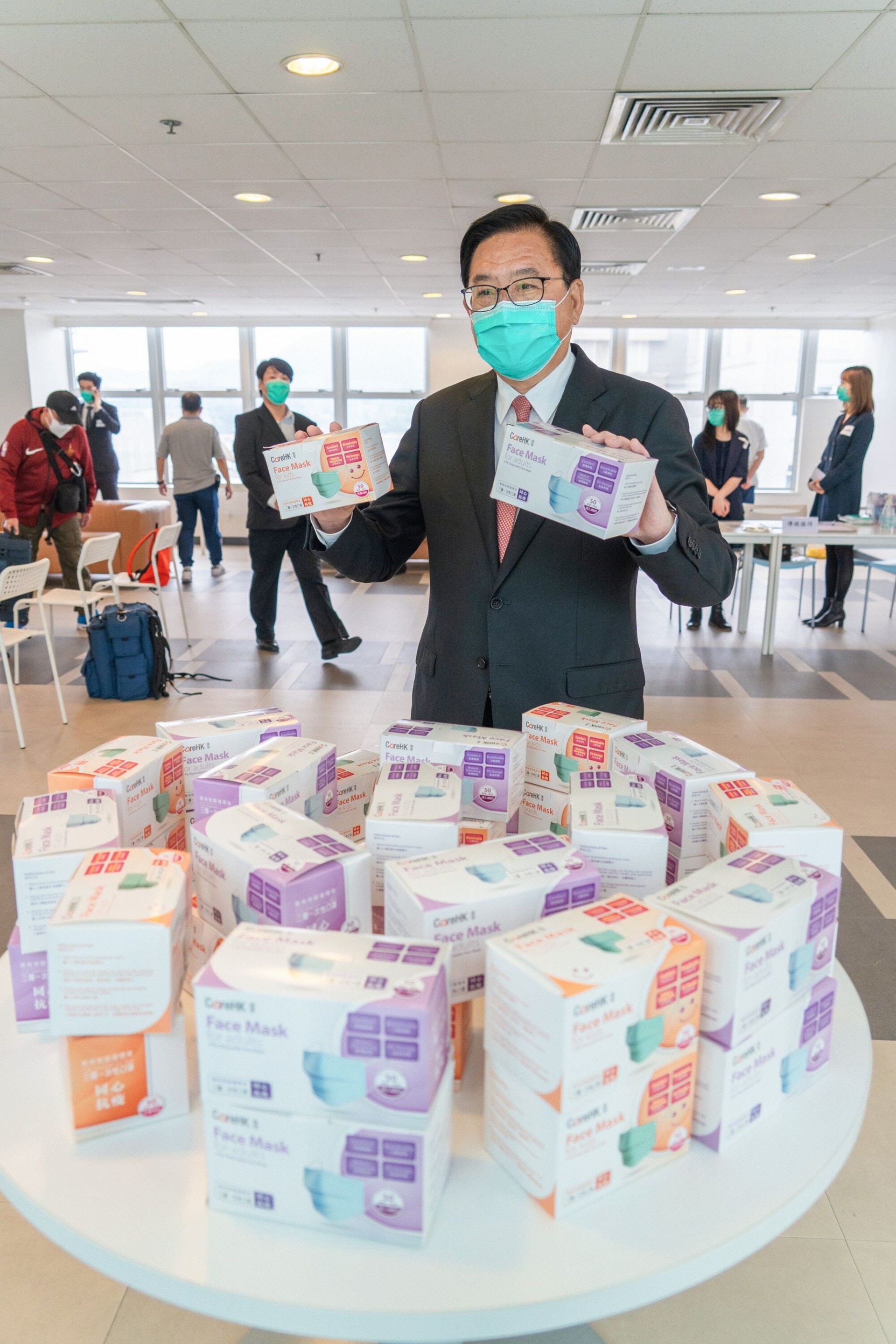 林健鋒表示,未來一年除了每月穩定供應口罩予廣大市民及政府部門使用外,亦承諾每月捐贈20萬個口罩予社會上有需要人士。