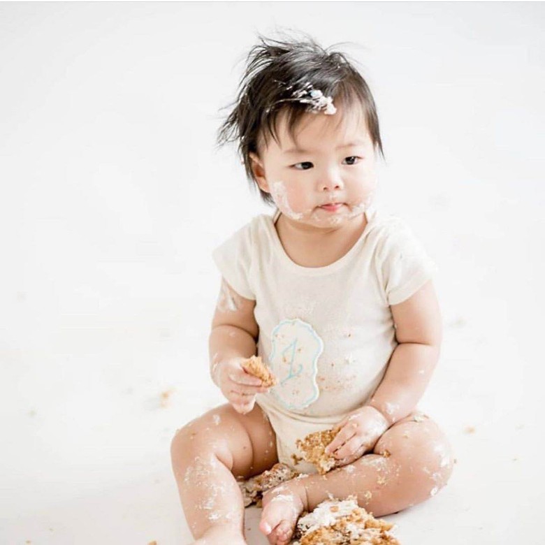相中一家三口都有出鏡,肥嘟嘟、凸晒腩的Jacob就坐在地上徒手食蛋糕,他不單食到手手腳腳都污槽晒,連凌亂嘅頭髮都黐晒Cream,非常為食!
