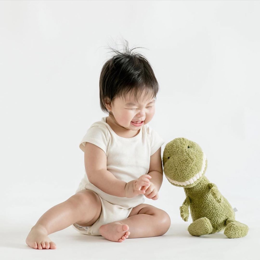 之後,Jacob亦有同恐龍公仔合照,他更學隻公仔依起棚牙笑,表情趣怪;最後,香香就抱住洗完白白的Jacob合照,場面溫馨!大家覺得1歲的Jacob可愛嗎?