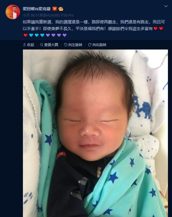 今日正日生日的徽徽,先在微博貼出剛出世的BB相及與老婆的合照,他留言表示:「如果讓我重新選,我的選擇還是一樣,路即使再難走,我們還是有路走,而且可以手牽手!即使美夢不長久,平淡是福我們有!妳們令我這生多富有。」