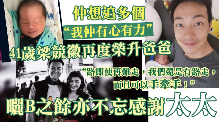 最近41歲生日的梁競徽,日前誕下第二胎,B仔出世時重7磅多,十分大隻,擁有濃密頭髮很可愛,湊夠「好」字,一家四口相當幸福。