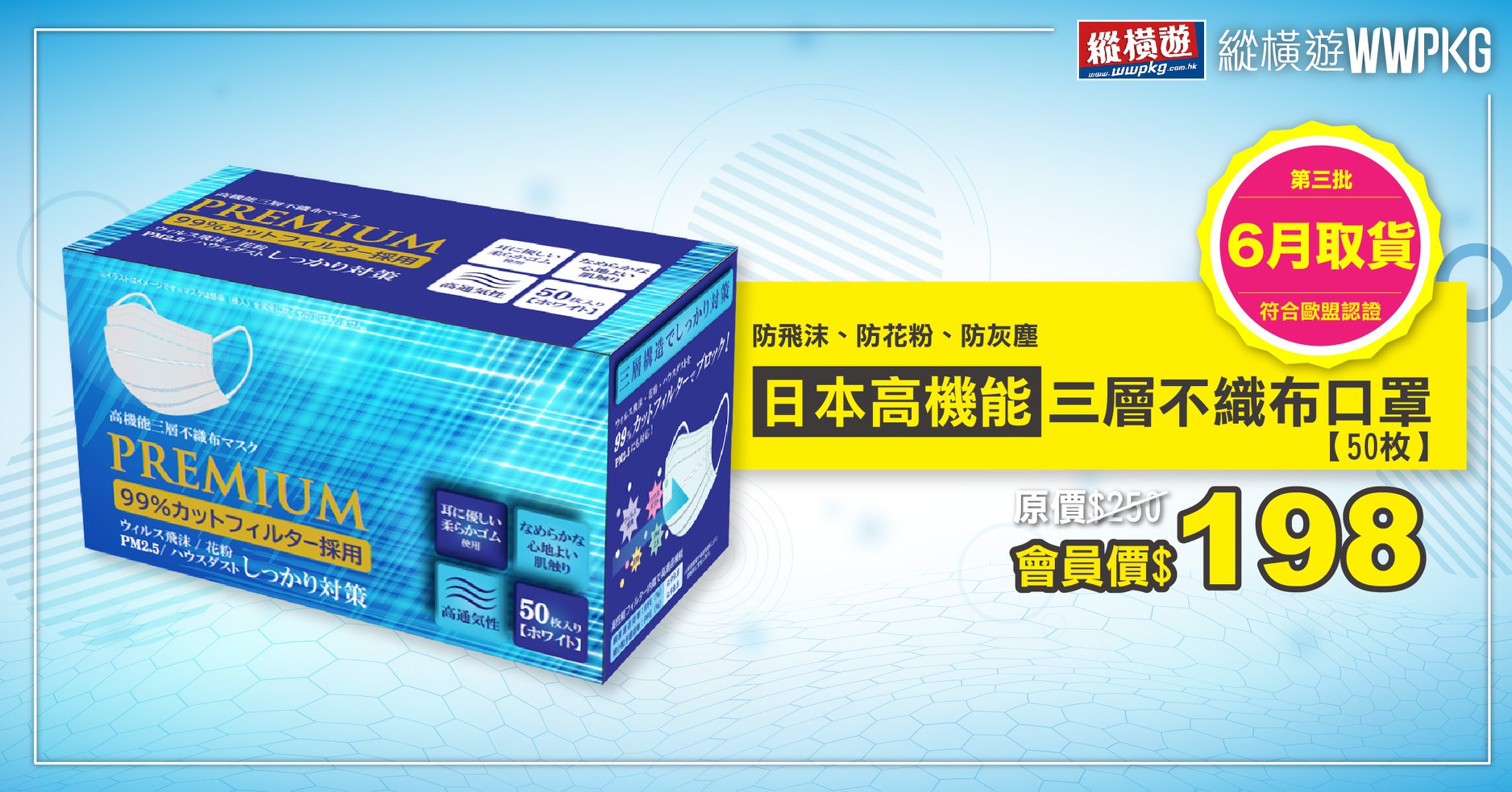 旅行社縱橫遊最近開訂日本口罩,會員限定價 $190 盒(更新:縱橫遊指新一批售價上調為 $198)。首兩批大受歡迎,指已經全部售罄,現新開訂第3批,6月中旬取貨。詳情如下: