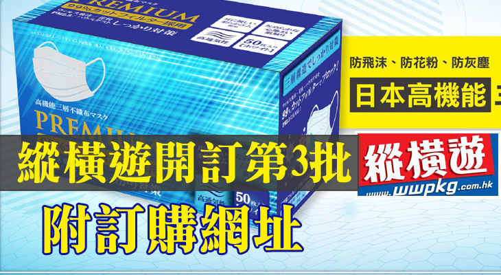 旅行社縱橫遊最近開訂日本口罩,會員限定價 $190 盒(更新:縱橫遊指新一批售價上調為 $198)。首兩批大受歡迎,指已經全部售罄,現新開訂第3批,6月中旬取貨。詳情如下: