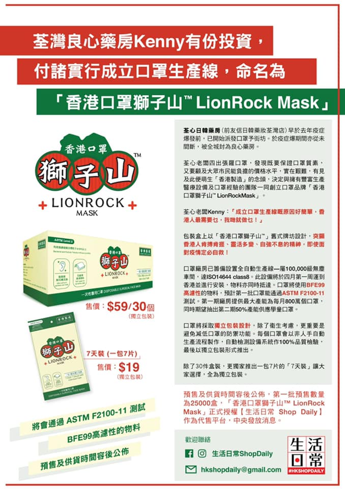 昨日知名藥妝店「荃灣友信日韓藥粧」將改名為「荃心日韓藥房」,老闆Kenny隨即更宣佈好消息,秉承著「每位街坊都可以有口罩用」的理念,決定投資本地香港口罩公司,口罩品牌名為「獅子山 Lion Rock Mask」。