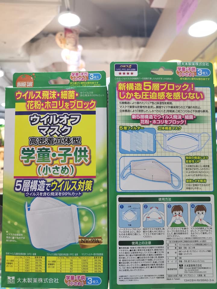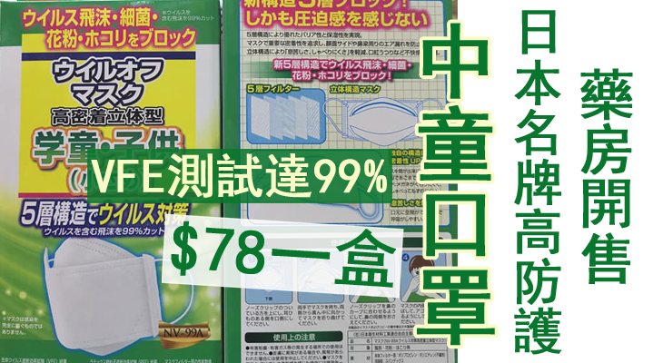Fun享健康家庭生活生活時事親子 【VFE測試達99%】藥房開售日本名牌高防護中童口罩 $78一盒 2020-04-04 Share on Facebook Tweet on Twitter 福港中西大藥行昨日在Facebook專頁表示,有少量日本名牌大木製藥廠的口罩發售,為中童尺寸口罩,口罩形狀類近KF94口罩設計。 店方表示,口罩支援 VFE/PFE 99% 防護,為5層設計。此口罩雖不是日本製,但是台灣製造,質素有保證。 搜尋 Travel 售價方面,一盒 $78/3個。有興趣的人士可查詢一下: 福港中西大藥行地址:興華邨興華廣場G07D 電話:2505 3360 Facebook專頁:按此 閱讀全文