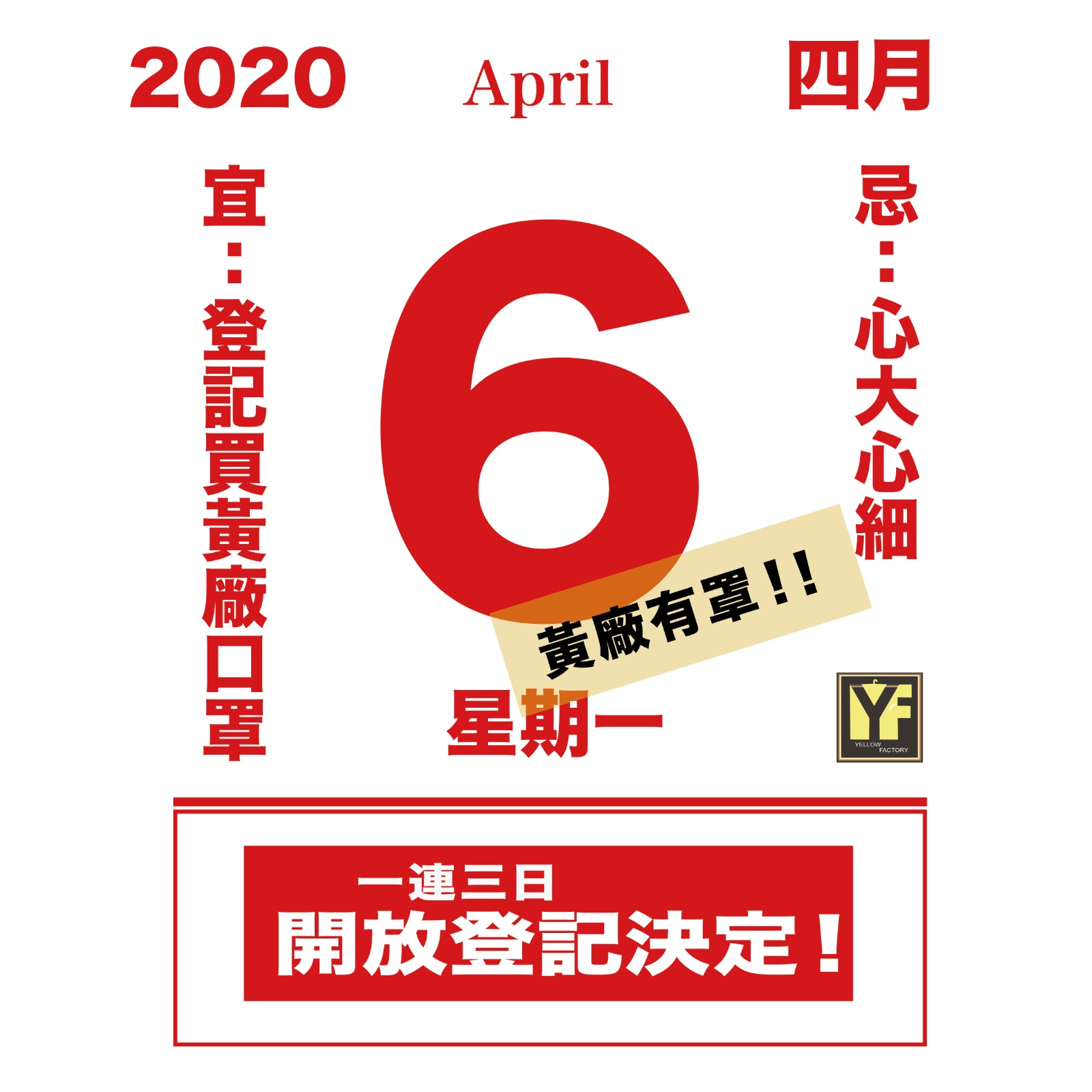 廠方剛在Facebook專頁宣佈,今天起一連三日,即4月6日(一)下午2點正至4月8日(三)下午6點正正式開始口罩預購登記。4月9日才開始售賣口罩。 因初售數量有限,會在登記買家中隨機抽籤一萬個名額作發售。