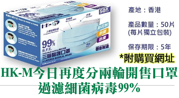 昨日香港口罩科技有限公司 HK-M開售口罩,大受歡迎。Facebook專頁發文指今天會再度開售同樣的口罩,詳情如下:
