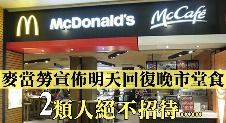 Fun享健康家庭生活生活時事 【麥當勞宣佈明天回復晚市堂食 2類人絕不招待!】 2020-04-07 Share on Facebook Tweet on Twitter 快餐店麥當勞上月25日起至4月7日的兩星期內,每晚6時起不提供堂食,只提供外賣及麥麥送訂餐服務。 麥當勞今日公布,明天4月8日晚上6時起,香港麥當勞將恢復晚市堂食服務,但注意爲了配合政府早前公布的餐飲業防疫措施,有2類人士絕不招待,包括任何發燒、沒有戴口罩之人士。 市民若於下午6時至午夜12時使用麥麥送服務,將會免運費,麥麥送免運費優惠會延長至4月20日。 閱讀全文