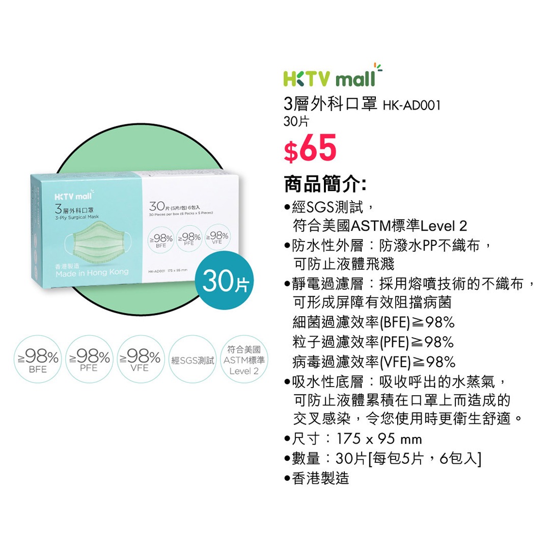 口罩一盒30片,每盒售價HK$65,尺寸為175 毫米乘以95毫米的成人口罩,每5片會有獨立包裝,一盒有6包。口罩經SGS測試符合美國ASTM標準Level 2。BFE≧98% ;PFE≧98%;VFE≧98%。
