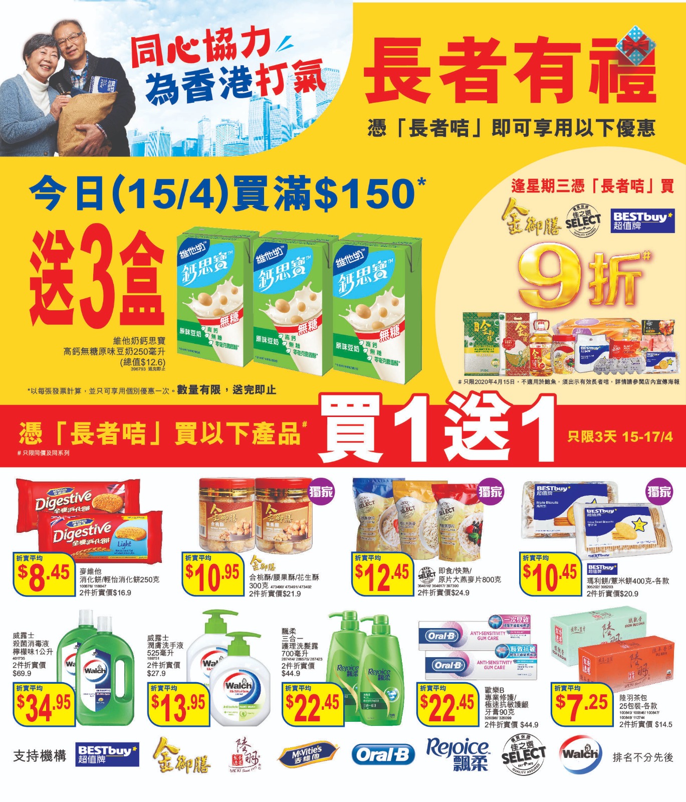 鑒於最近長者於嚴峻疫情下的生活需要,百佳將優惠內容擴大 ,由今天(4月15日)開始,長者於全線香港百佳及旗下超市(GREAT Food Hall 及 CKC food le parc 店舖除外)購物並出示「長者咭」,即可享受三重優惠。