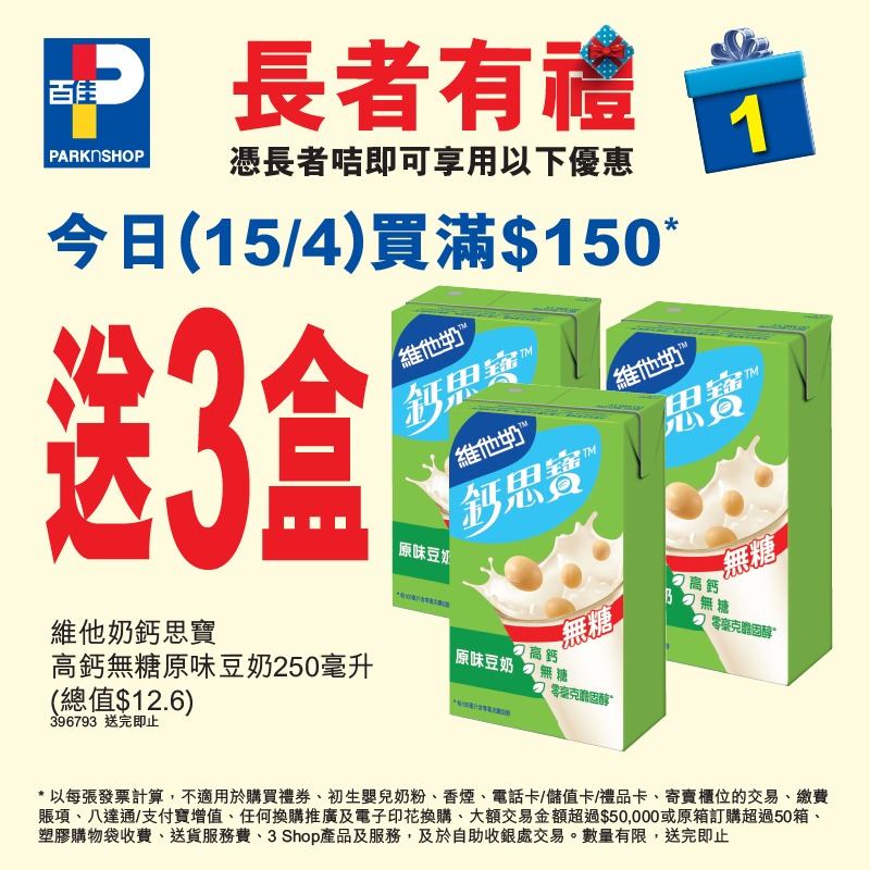 周三限定小禮品大贈送 (優惠期:15/4,22/4 及 29/4)一連三星期,老友記逢周三於百佳店舖買滿港幣$150,即可獲贈一份百佳為老友記準備 的精選貨品。