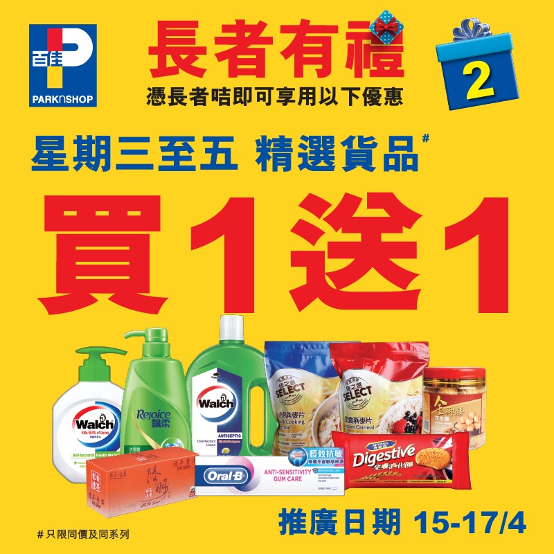 每周三天精選產品買一送一 (優惠期:15 ‐ 17/4 及 22 ‐ 24/4),百佳每周為老友記挑選 8‐9 款常用食品、日用品及抗疫產品,逢星期三至星期五一連三天,老友記憑「長者咭」於百佳購買同價同系列之指定產品,即可享用買一送一優惠。