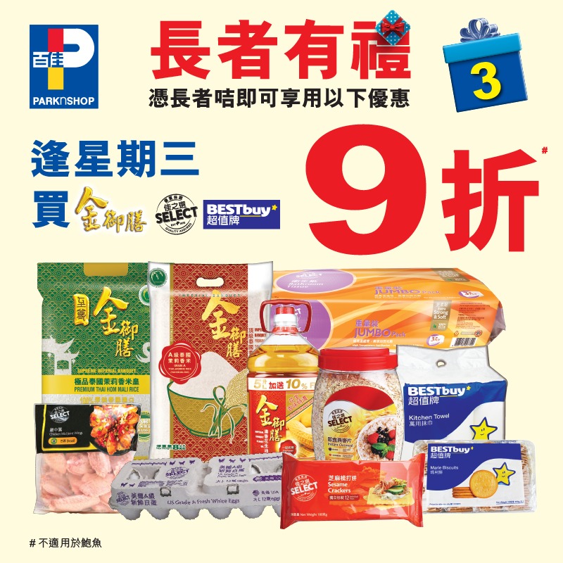每逢周三,老友記均可繼續享受「超值牌」、「佳之選」 或「金御膳」貨品9折購物優惠,品牌產品涵括必備食材及日常家居用品。