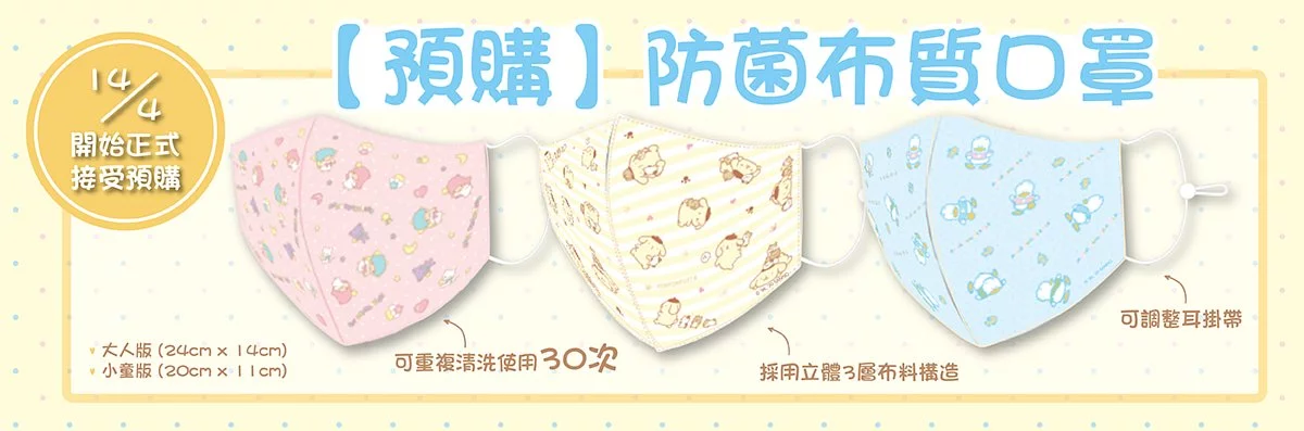 在4月14日起,Sanrio於Sanrio Gift Gate Online Shop預售防菌布質口罩,有成人及小童款式,分別有LITTLE TWIN STARS、布甸狗和AP鴨公仔,成人及小童一共6款,每個售49.9元。此次預訂不設門市預售。