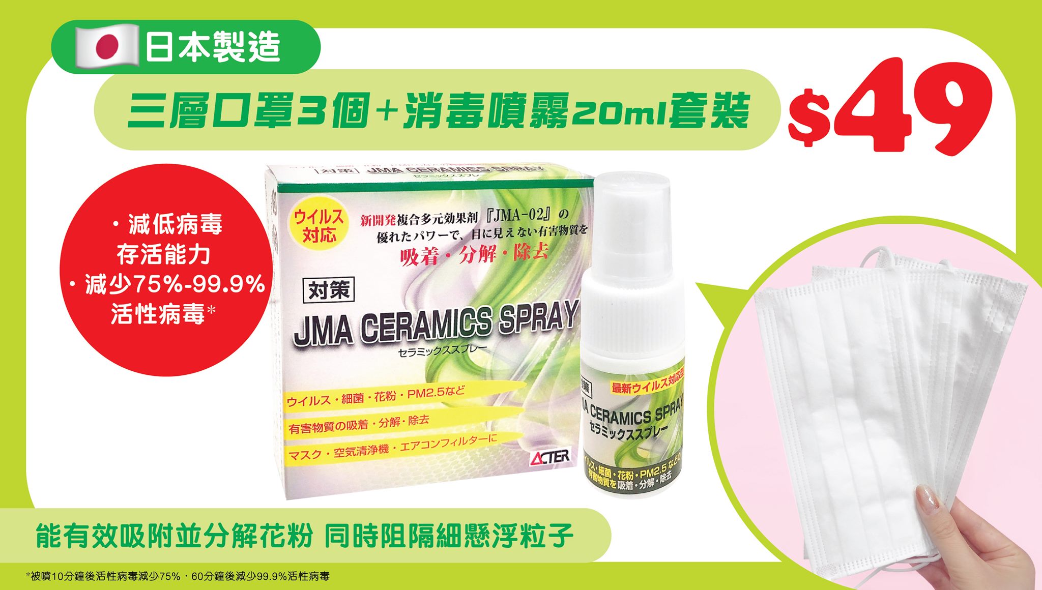 日本城稱,JMA Ceramics Spray 噴霧能減低病毒🦠存活能力,適用在口罩😷、空氣清新機過濾網、冷氣機隔塵網等。