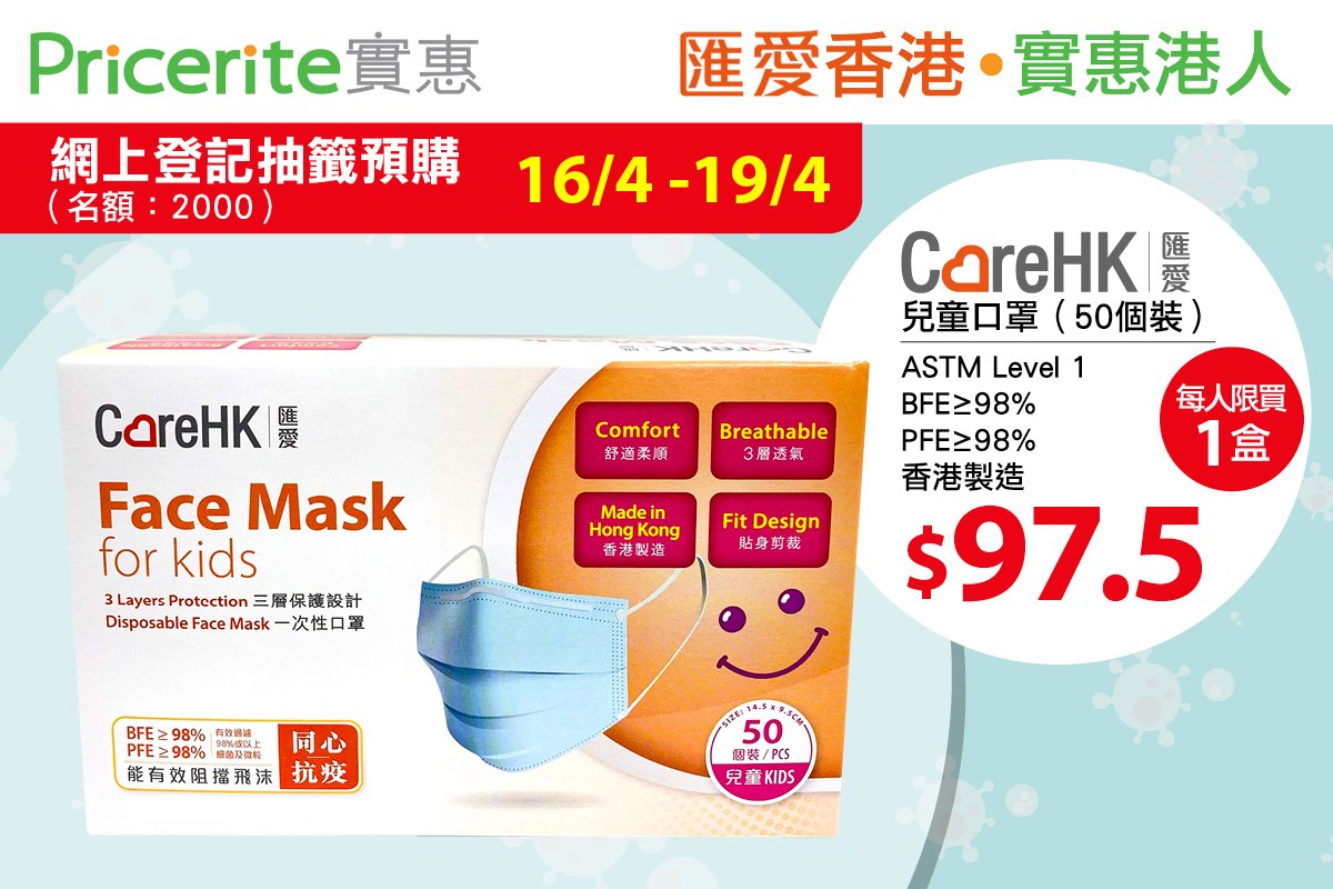 實惠宣佈即時可在網上預訂 CareHK 兒童口罩。 店方指,2000盒CareHK兒童口罩將以網上登記抽籤購買,每人限登記一次,成功中籤人士可於指定時間於 Pricerite 實惠門市取貨,登記詳情如下: