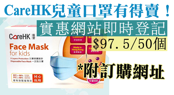 實惠宣佈即時可在網上預訂 CareHK 兒童口罩。 店方指,2000盒CareHK兒童口罩將以網上登記抽籤購買,每人限登記一次,成功中籤人士可於指定時間於 Pricerite 實惠門市取貨,登記詳情如下: