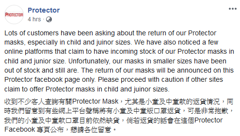 官方網站開放幾日後,最近竟然亦有其他網上平台聲稱有Protector小童及中童口罩出售,故此Protector昨日發聲明澄清,指小童中童size至今仍然缺貨,若有新貨上架會在官方Facebook宣佈。